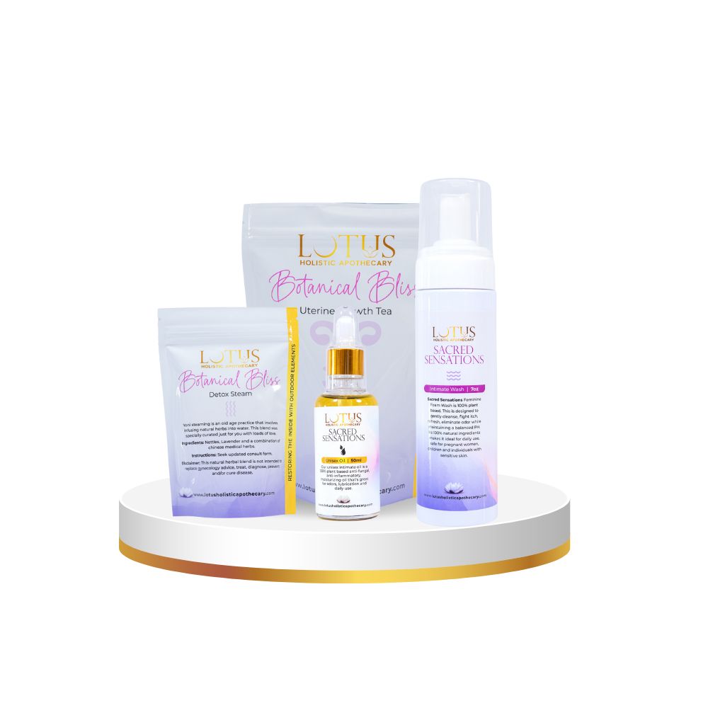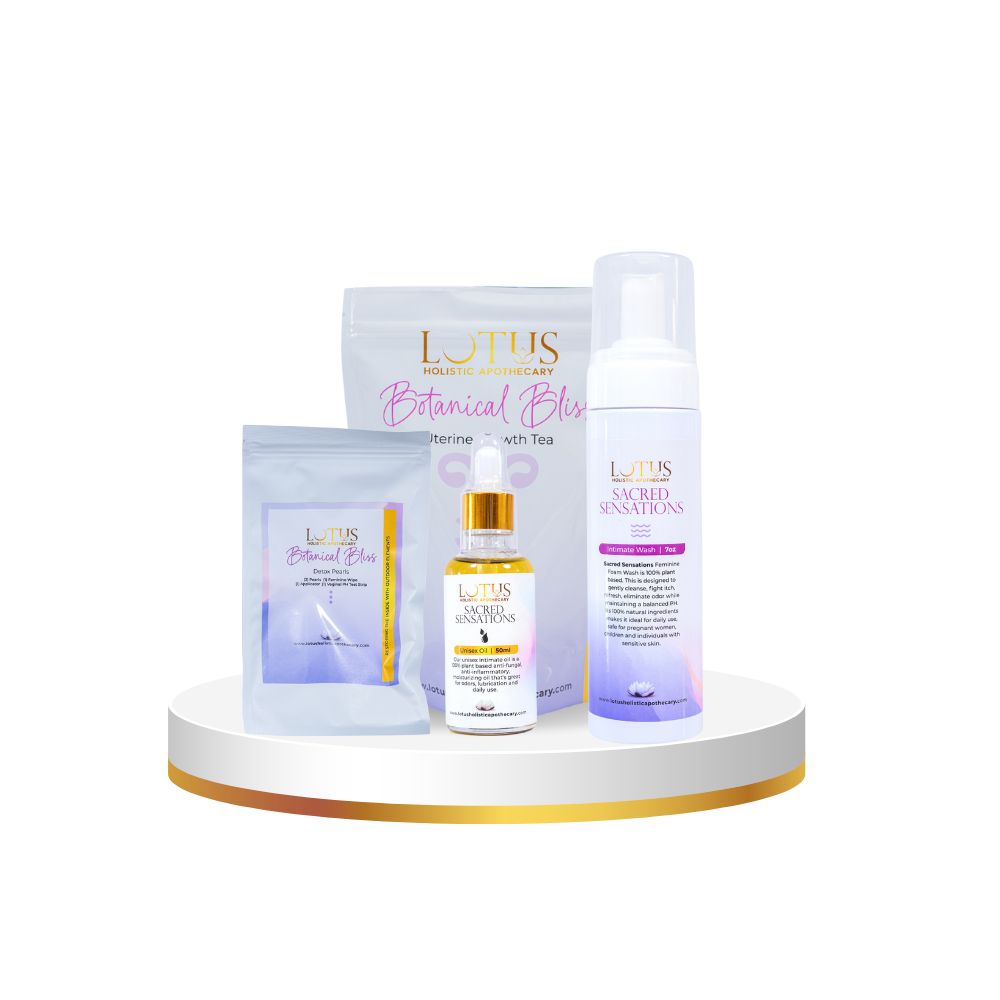A) 3 Pearl kits + 1 Uterine Growth Tea + 1 7oz Feminine Wash + 1 Unisex Oil